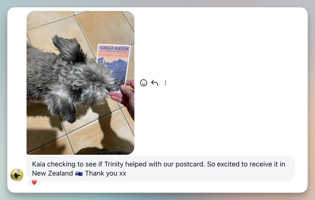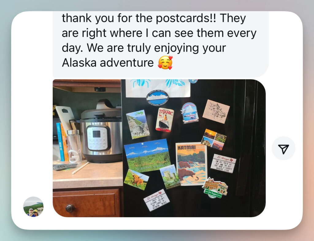 We’ll choose a postcard from a place we visit and handwrite you a personal note from that day.